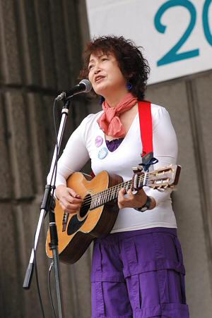 憲法集会で歌う![]() 5月3日、日比谷野外音楽堂で8つの市民団体によって行われた憲法集会で歌いました。トップバッターで「戦争入門」と「おなじ空おなじ子ども」を。「おなじ空おなじ子ども」は、手話通訳の方に急遽手話を教えていただいて、会場全員で手話をしながら一緒に歌ってもらいました。みんなで手話をしながら歌う姿は、とても壮観でした。 憲法集会は、今まで日比谷公会堂で行われていたのですが、改憲が叫ばれるこの時期、会場を野外音楽堂に移したそうです。2時間も前から続々参加者が集まって、私が歌う時にはもう会場いっぱいでした。朝日新聞によるといつもより2000人多く、5000人の参加者だったそうです。一方「新しい憲法をつくる国民会議」は、千代田公会堂で行われ、450人の参加者だったとやはり朝日新聞は伝えていました。 この参加人数の差に注目しましょう。 東京だけでなく、名古屋の憲法集会での2100人をはじめとして、この日、「憲法守れ」と、全国で集会パレードが開かれました。「悲願の時がきた」と民主党の議員も参加した改憲派も気勢をあげたそうですが、「憲法を守ろう」と行動に移す人の方が、数においてずっとずっと多いのです。 確かに、国会だけでは憲法を守ることは難しい状況ですが、国会外の憲法を愛する人たちは、いっぱいいて、そして、その一人一人が行動する力を持っています。その力を実感しました。また、会場の参加者の明るい顔も印象的でした。時代状況が厳しくなっても、「戦争をしない国で生きる権利」を、明るく勇気をもって行動し、伝えていこうと改めて思いました。 さて、会場には、なんと輝き隊のメンバーが、チラシを張ったプラカードを持って前列にズラッと。15人も集まってくださったそうで、とても目立ちました。「輝き隊の皆さんのVIVA Tシャツを着た皆さんもすごいですね、憲法集会というよりコンサート本番のような錯覚を一瞬覚えました」と、写真家の亀井正樹さんが写真を送ってくださったのでご披露します。 その日私は、国立のスタジオで3時から全国ツアーのリハーサルがあり、出番が終わるとすぐ会場を後にしましたが、輝き隊のメンバーは集会後のデモにも参加されたそうです。私は、安田さん、劉さん、杉田さんと夜8時までリハーサルをしました。これで全国ツアーの演奏プログラムは、準備万端です。 横井久美子 2004年5月4日 |