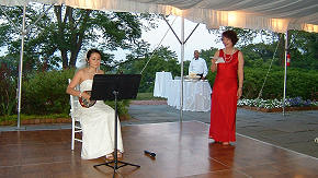 私は、久しぶりにサンシンの音を聞き、その響きのよさにびっくり。ギターなどに比べ、サンシンの音は、野外でとても強く響く。やはり、サンシンは、沖縄の美しさと哀しさと強さとしたたかさを象徴する楽器。日本人でもそれほどナマ音でサンシンの音を聞いていないし、アメリカ人は尚更だからとても喜ばれた。途中でケーキカットもあり、9時過ぎて辺りが暗くなり、最後は、夫が、ワシントン大統領も立ったという階段で、花嫁花婿と並び、お礼のスピーチを英語でし、その後、娘の持つブーケを未婚者に投げて、すべてが終了。 最初のセレモニーのあと、ダンスとサンシンと弟さんと夫の二つのスピーチとケーキカットと食事、たったこれだけで4時間も過ごした。その間ずっとカルテットの演奏が、緑の庭園や参列者同士の会話の間を流れていた。異国でたくさんの厳しい挑戦をし、それを乗り越え、確実に実らせてきた娘の新たな旅たちに、母親として誇りに思い、心から拍手を送った。 |